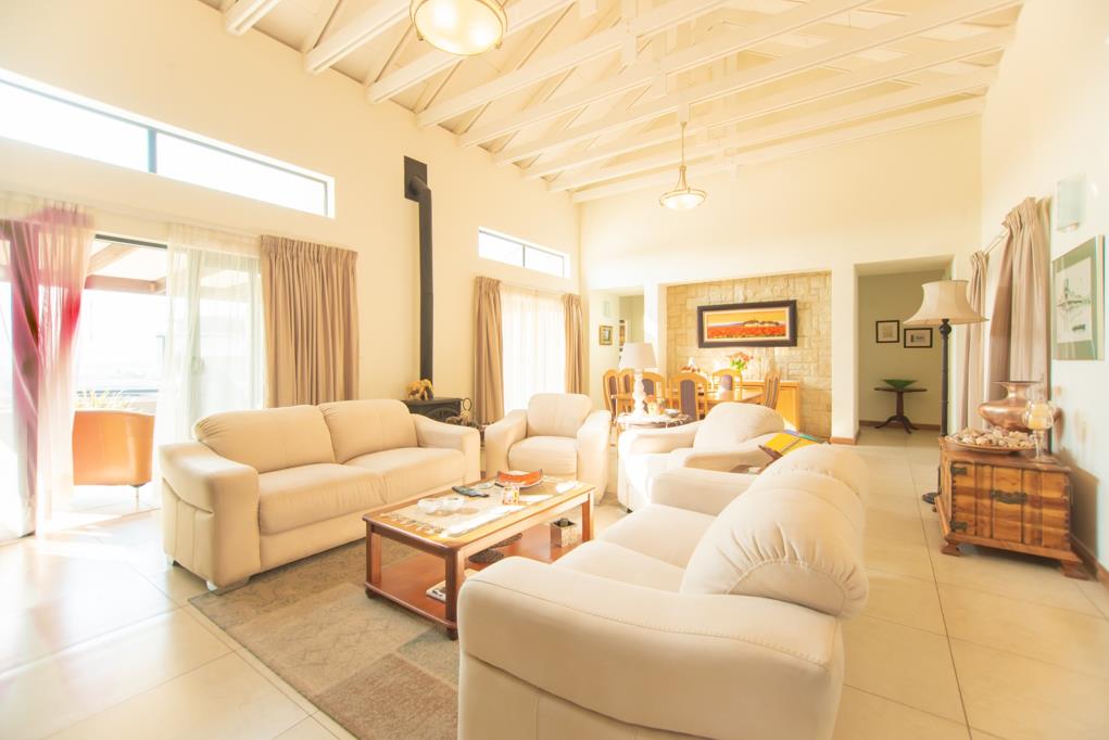 Designed to embrace natural light and breathtaking views, the expansive open-plan living spaces boast soaring ceilings and generously sized windows. The heart of the home is the elegant lounge, where a captivating fireplace creates a warm and inviting atmosphereperfect for cozy winter evenings. Just beyond, an impressive entertainment area with a built-in braai seamlessly extends to the meticulously landscaped garden, offering an idyllic setting for gatherings or quiet relaxation.