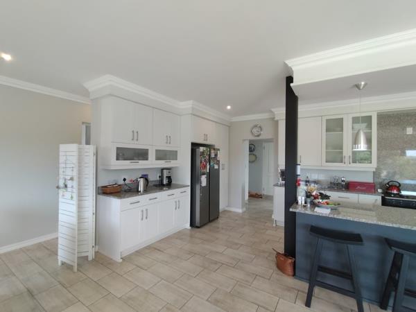 The kitchen is very well designed with a large island focus point, ample cupboard space, gas hob, granite tops, huge walk-in pantry and separate scullery.
