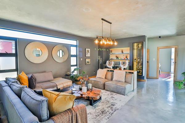 Lounge with fireplace, surround sound, built in display cabinet and cement ceilings