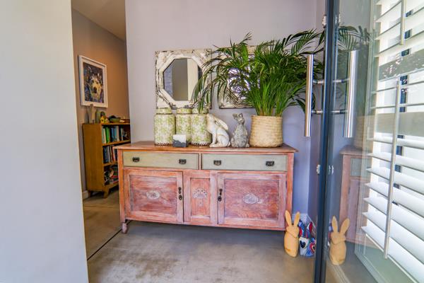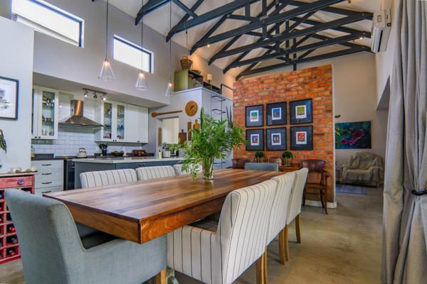 Step inside to be greeted by soaring double-volume ceilings with exposed beams, enhancing the open and airy ambiance. The thoughtfully designed open-plan living spaces include a spacious dining room and lounge, both opening onto the inviting patio, creating the perfect indoor-outdoor flow.