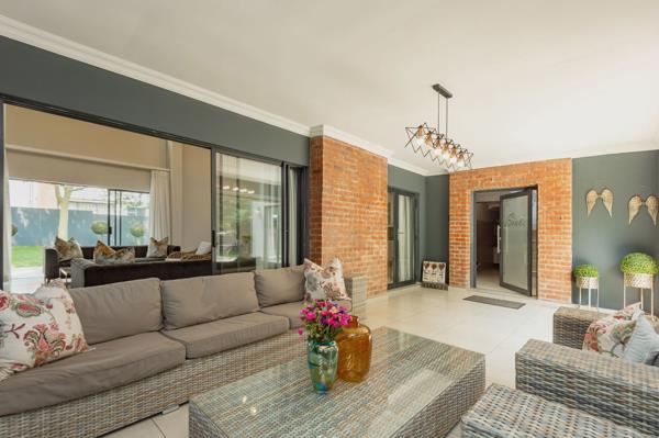 Upon entering, you are welcomed by a spacious, double-volume open-plan living area that seamlessly connects the modern kitchen, dining, and lounge spaces. Designed for effortless indoor-outdoor living, the home features large sliding doors that open onto a covered patio with a built-in braai, overlooking a beautifully landscaped garden and a sparkling swimming pool. This inviting entertainment space is perfect for relaxing with family or hosting guests.