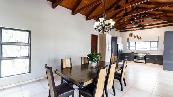 Open plan dining and kitchen area with open trusses and door to covered patio