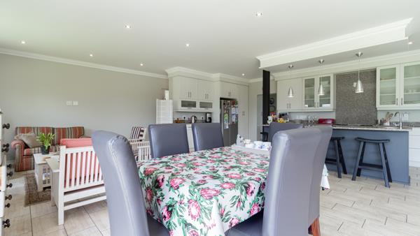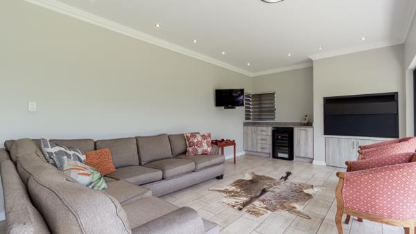 Open plan entertainment area with built in gas braai, cupboard space and stackers onto the garden