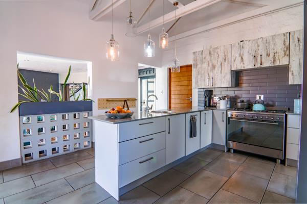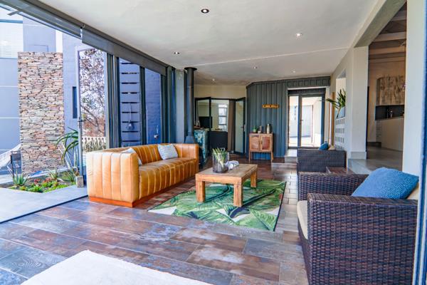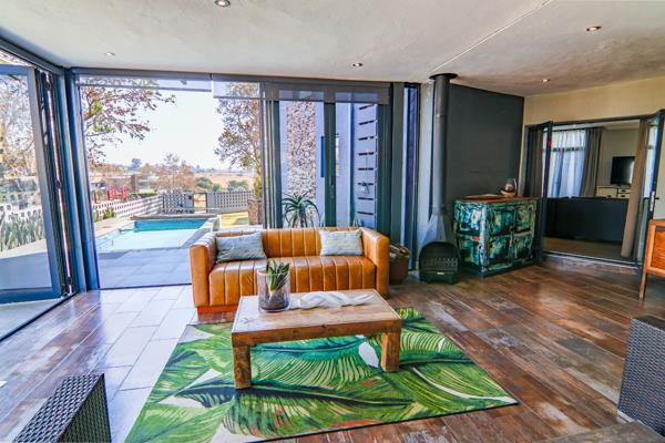 The open-plan dining area, complete with built-in fireplace/braai, flows seamlessly into the stylish farm-style kitchen. Expansive stacking doors open from the lounges onto the pool deck and a versatile entertainment patio, making indoor-outdoor living effortless year-round.