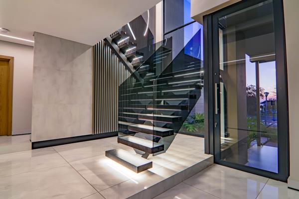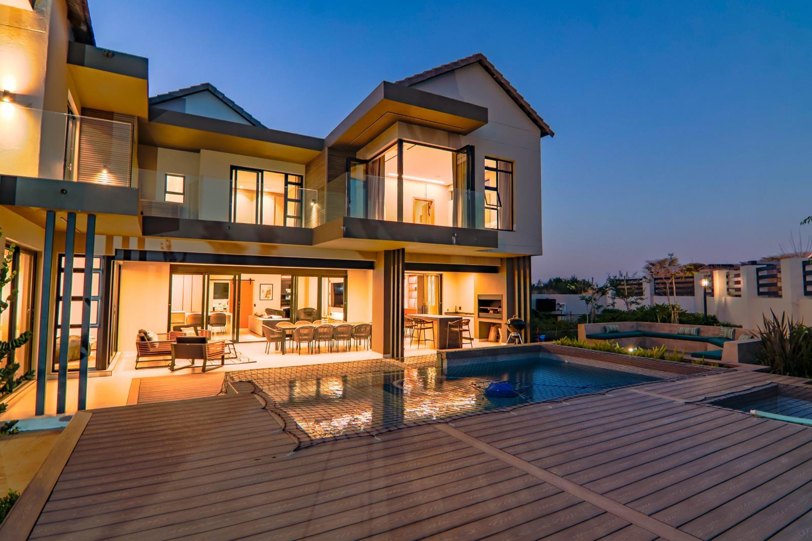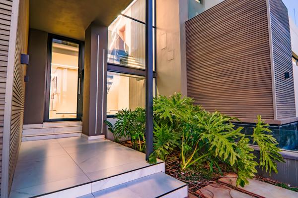 Expansive living and entertainment areas flow seamlessly to a large covered patio complete with a built-in bar, braai, and prep station. The outdoor space also includes a boma, jacuzzi, glass-rim heated pool with a safety net, and a generous pool deckperfect for hosting in style.