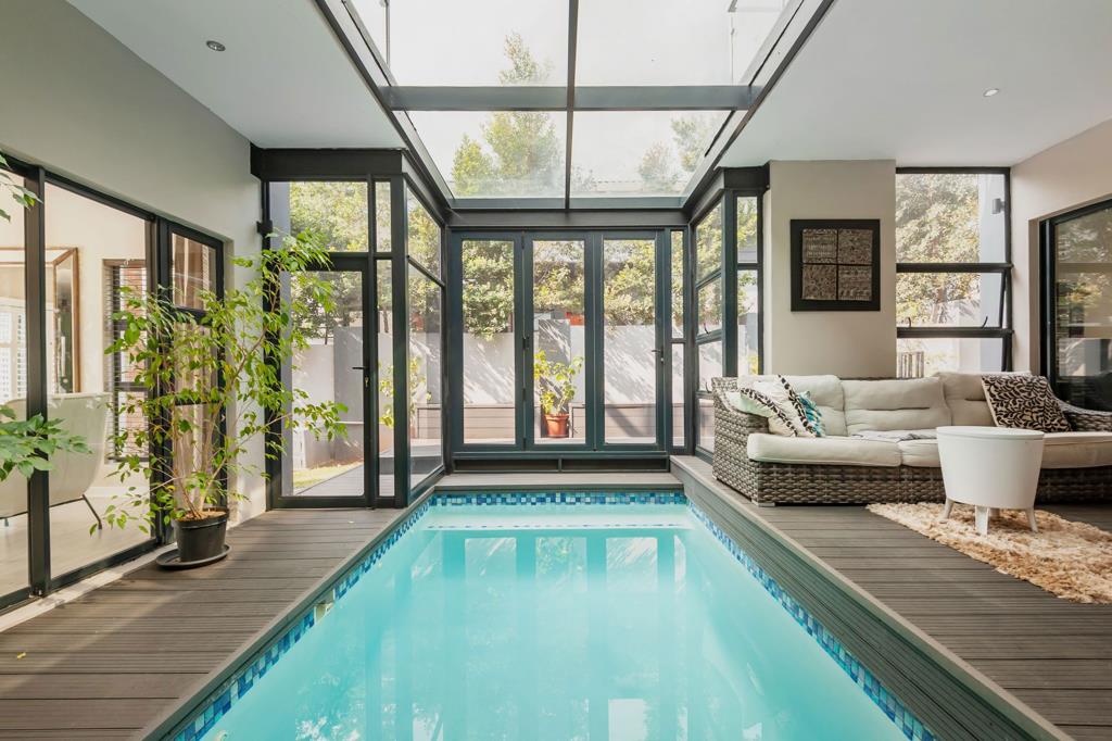 Step inside to find an indoor swimming pool at the heart of the home, elegantly surrounded by the formal lounge and dining roomeach space framed with glass doors that open up to showcase the sparkling blue water.