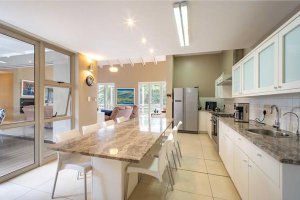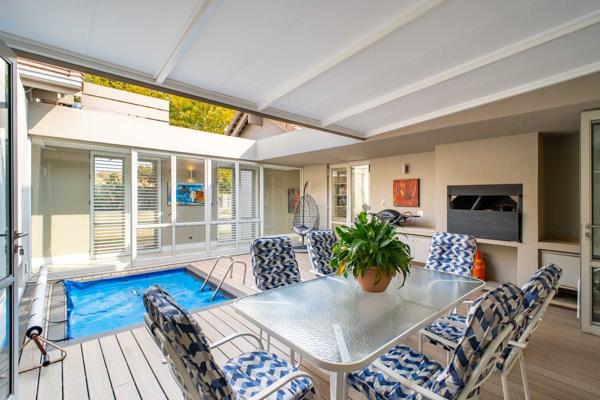 At the heart of the home lies a striking indoor entertainment patio,a built-in braai, a splash pool, and composite decking.The house has complete stacking doors around this entertainment area that welcomes sunlight into the center of the home. This space flows seamlessly into a generous open-plan living area featuring a cozy gas fireplace and direct access to a large north-facing balcony with sweeping views of the estate and mountain backdrop.Soaring vaulted ceilings with exposed beams and American shutters throughout enhance the homes bright, coastal-inspired ambiance.