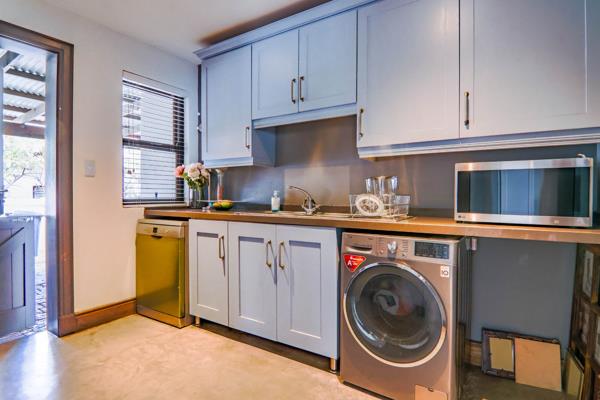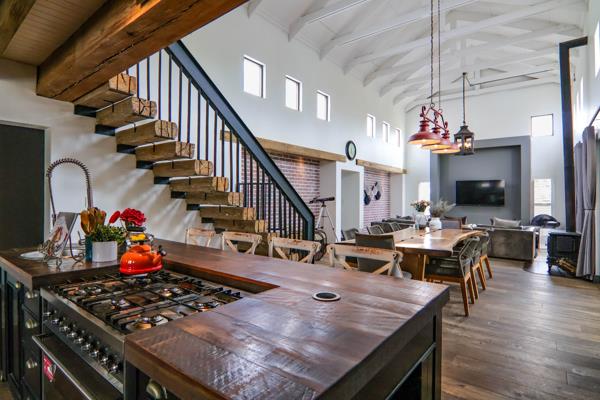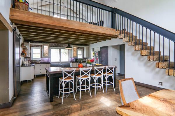 Upstairs, a spacious air-conditioned loft provides versatility as a games room, study, or pyjama lounge. The open-plan living areas seamlessly flow to a covered patioenclosed on three sidesoverlooking the solar-heated pool and with a built-in braai, perfect for year-round entertaining.