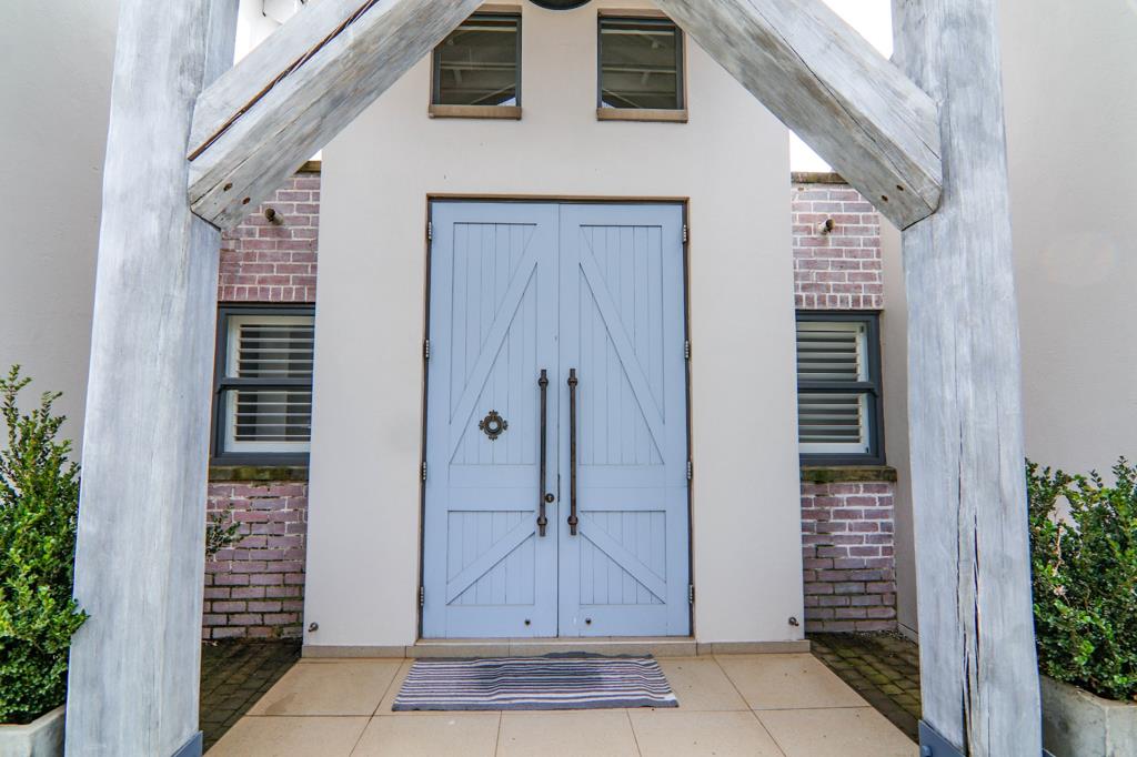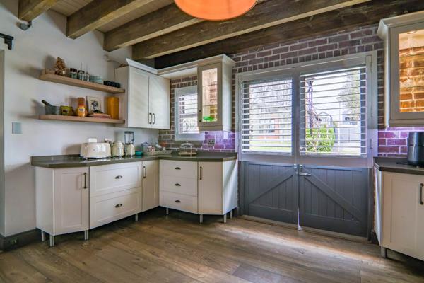 Five en suite bedrooms each open directly onto the veranda and garden, offering serene views and private outdoor access. The heart of the home is the open-plan kitchen, featuring a central island with a solid wood block countertop, complemented by a separate scullery, walk-in pantry, and charming double stable doors leading to the courtyard.
