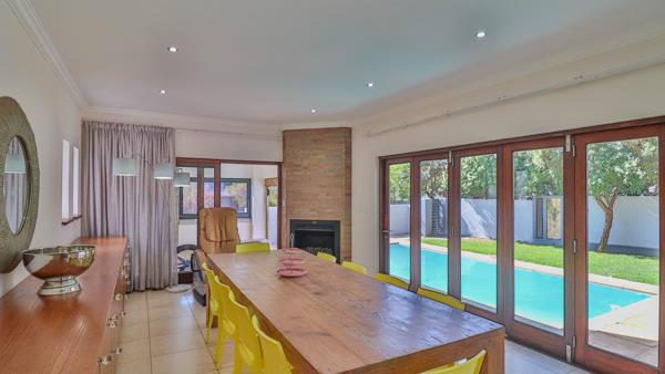 Open plan dining area with built in server, gas fireplace and doors opening onto pool and covered patio