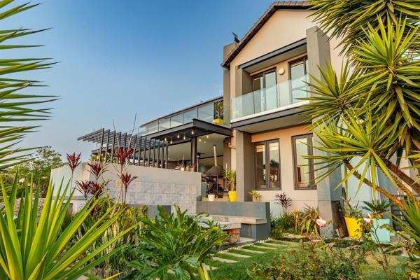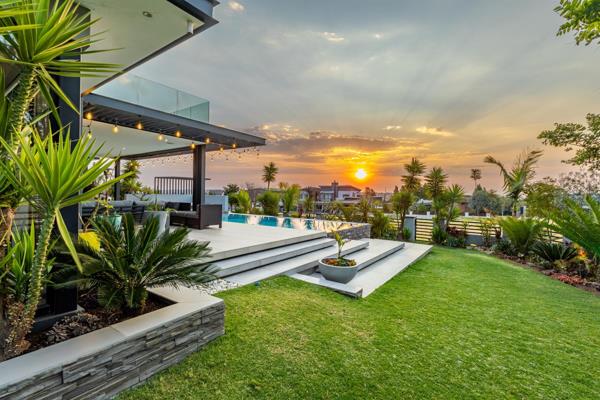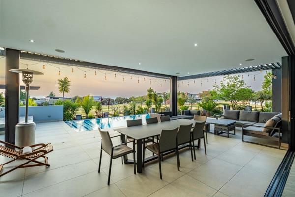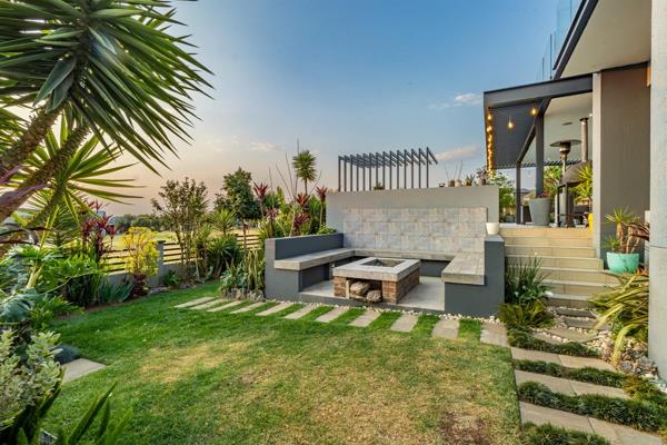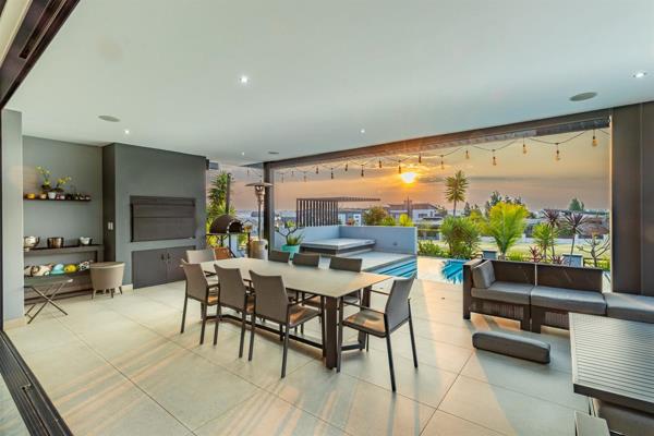 The home is designed for hosting, with a built-in 1.2m braai, a sunken boma with seating, retractable patio blinds, ceiling-mounted speakers, and a beautifully landscaped garden with automated irrigation.