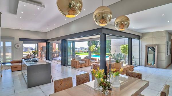 Open plan lounge with gas fireplace and built in unit for TV and display cabinets