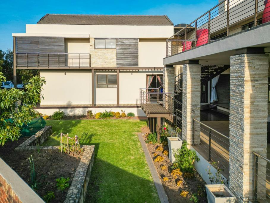 Large doors open onto an expansive covered patio fitted with both gas and wood braais, overlooking the tranquil surrounds of the estate ideal for long afternoons, easy entertaining, and year-round enjoyment.