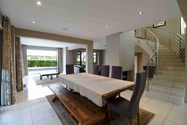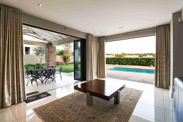 A striking double-volume glass entrance hall sets the tone, leading into spacious open-plan living and entertainment areas designed for versatility and warmth. The inviting fireplace creates a cozy focal point, while stacking glass doors open seamlessly to a covered patio with a built-in braai and a sparkling pool. The beautifully landscaped garden enjoys sweeping views of the golf course, driving range, and iconic Clubhouse the perfect backdrop for family living or entertaining.