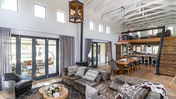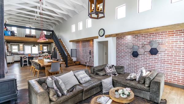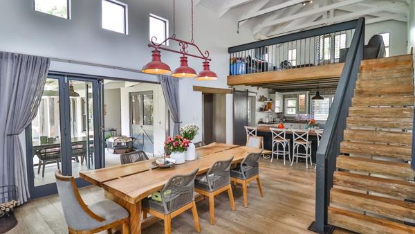 Open plan double volume lounge and dining with exposed trusses and doors leading to covered patio and fireplace
