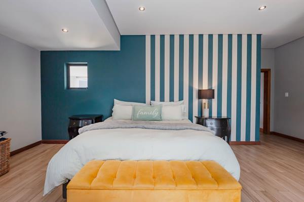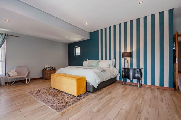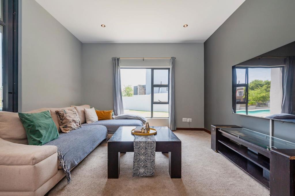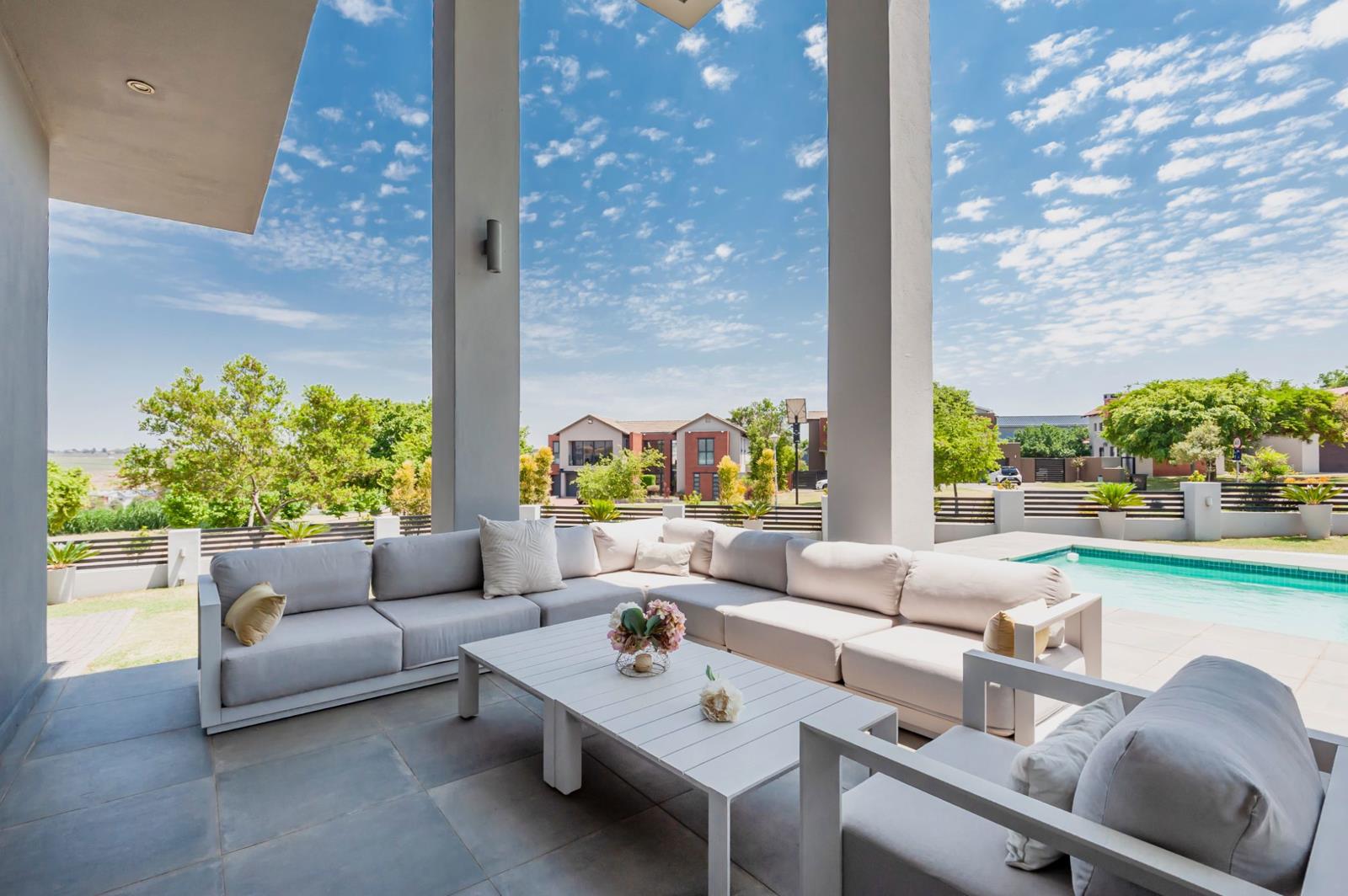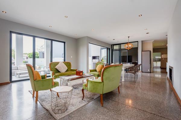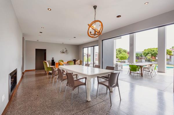 Large stacking doors and expansive windows wrap around the living spaces, filling the home with natural light and connecting effortlessly to the outdoor entertainment area. Here, youll find a covered patio with a built-in braai overlooking a sparkling swimming pool perfect for relaxed gatherings or summer evenings.