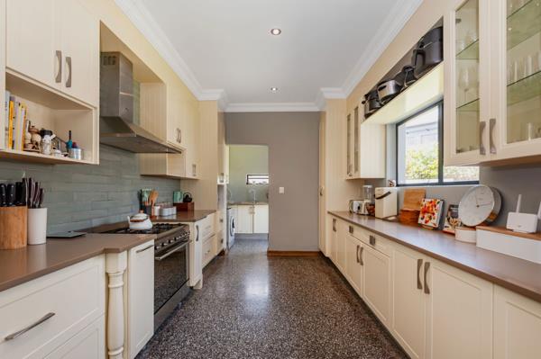 The modern kitchen, with its central island, is fitted with a prep basin, gas oven and stove, and space for a large double-door fridge. A separate scullery provides additional convenience with room for three appliances.