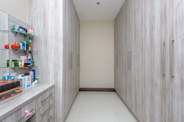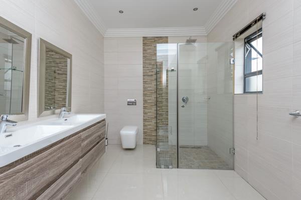 The main bedroom features a walk-in wardrobe and an ensuite bathroom, with stacking doors opening to the lush garden. The second bedroom offers both privacy and convenience with its ensuite bathroom and built-in cupboards. The 3rd and 4th bedroom/study share a well-appointed family bathroom. The kitchen is bathed in natural light, equipped with ample cupboards, and a scullery that accommodates three machines and an extra fridge.