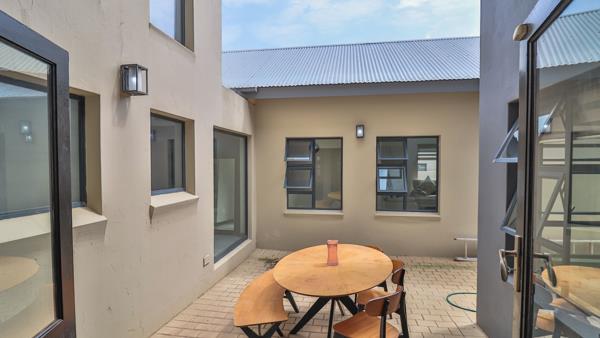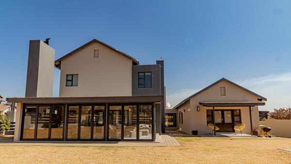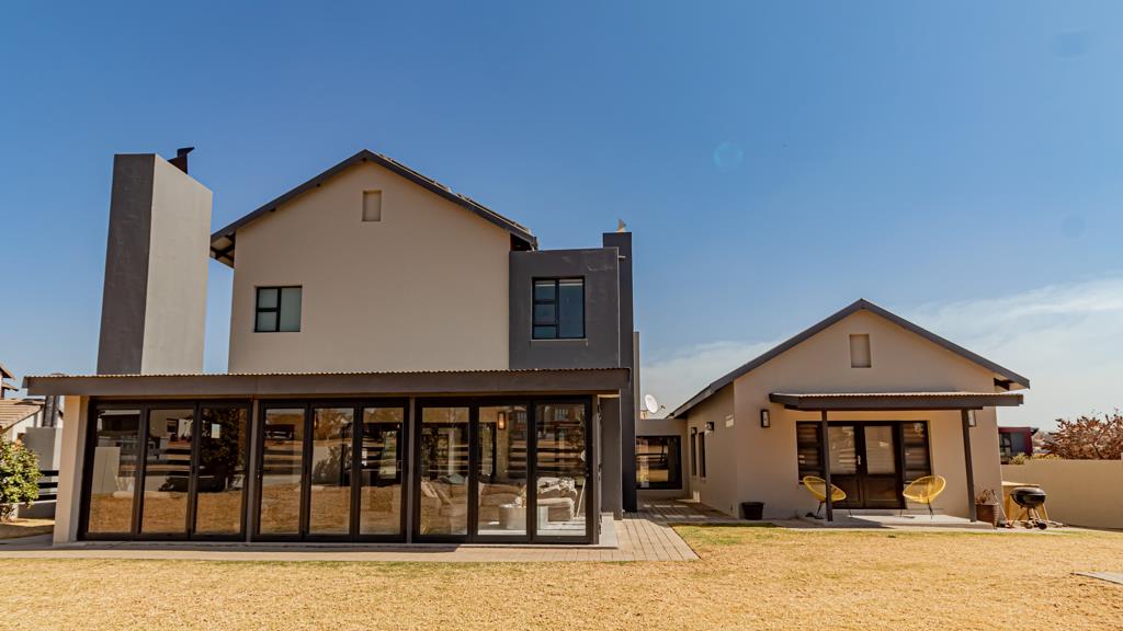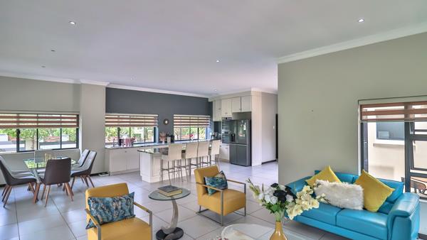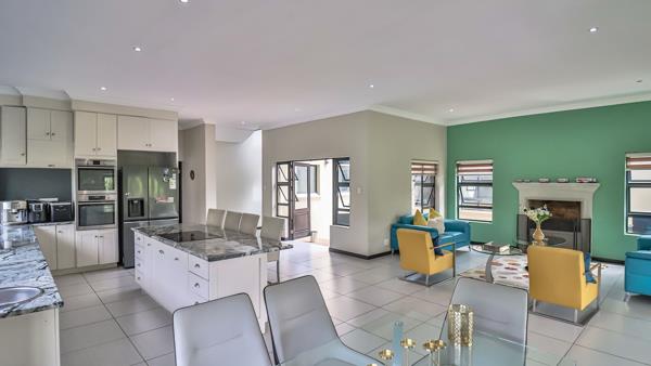 The open plan lounge area has a fireplace and leads to the covered patio with stacker doors. These doors open onto the garden and pool. The open plan dining room flows seamlessly into the living spaces.