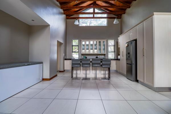 The open-plan living areas are light and airy, featuring exposed beams and double-volume ceilings that create a wonderful sense of space. Stacking doors open seamlessly onto a covered patio with a built-in braai, making it the ideal setting for relaxed family gatherings and effortless entertaining.