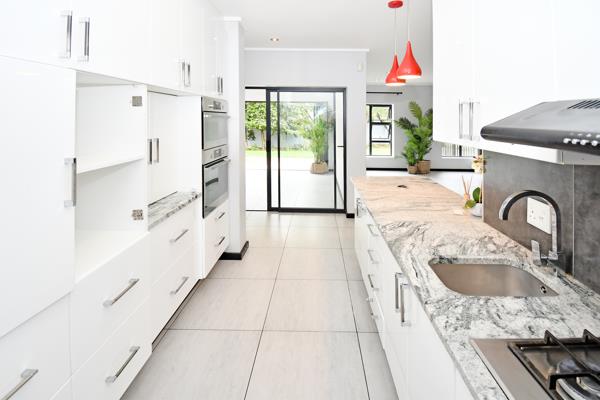 The interiors are modern, warm and thoughtfully designed, with no carpets anywhere and high-quality finishes throughout. The kitchen is a real highlight, offering two eye-level ovens, a gas hob and a separate scullery with space for two under-counter appliances. The living areas flow smoothly to a covered patio and a sparkling pool, creating an inviting space for entertaining or simply enjoying time with family.