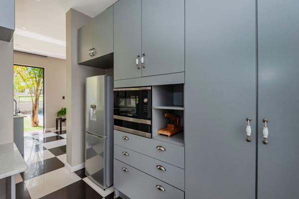 Open-plan kitchen with modern finishes, ample cupboard space, and a generous scullery