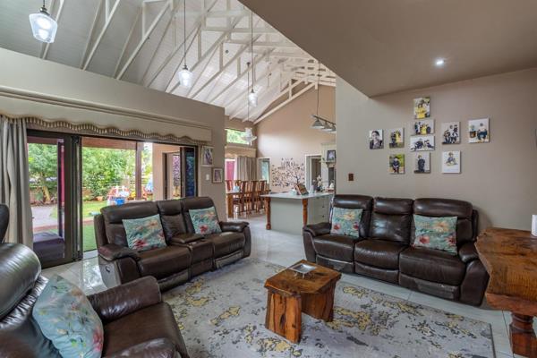 The home opens into a spacious open-plan layout featuring a bright tiled lounge with built-in cupboards and a sliding door that flows seamlessly outdoors. The kitchen is fitted with a gas stove, oven, double sink, built-in cupboards, and stylish quartz countertops. A fully equipped scullery offers a double sink, quartz tops, space for a washing machine and dishwasher, and a door leading outside.