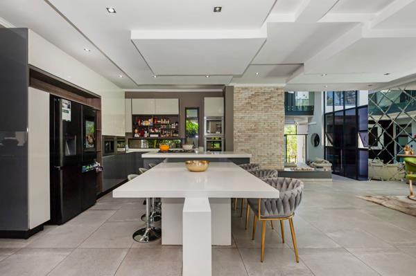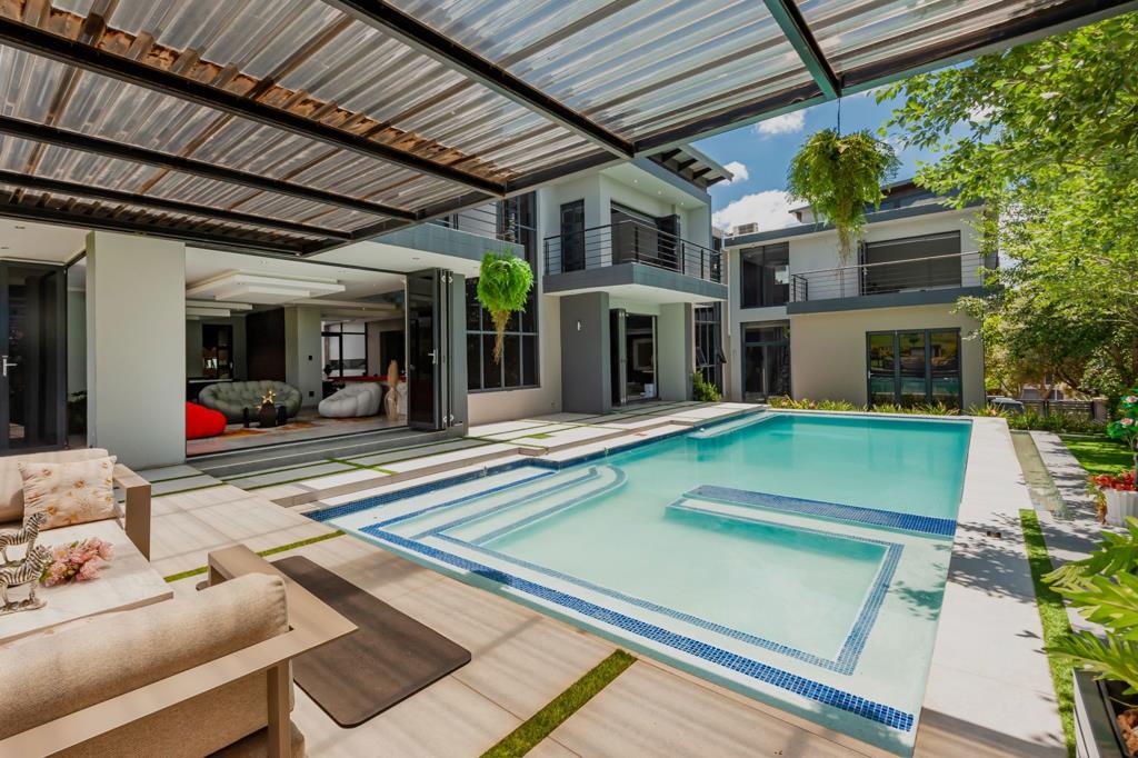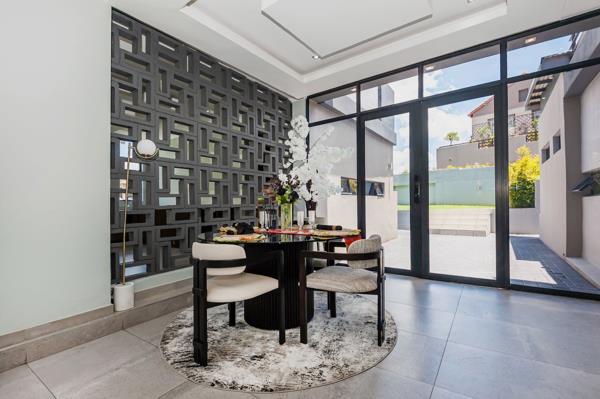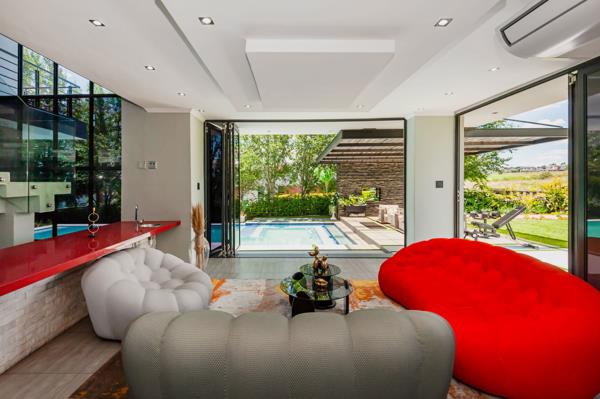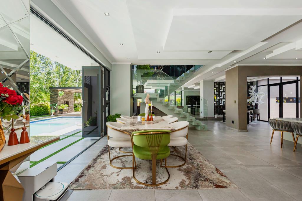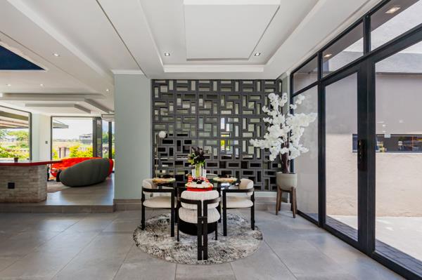 Adjacent to the kitchen are two dining areas a formal dining room overlooking the swimming pool, as well as a breakfast seating area. The entertainment room is perfect for hosting, offering an indoor braai, gas stove, and a fully fitted bar. Stacking doors open seamlessly onto the pool area, creating a indoor-outdoor flow. A dedicated space with provision for a home salon adds an extra touch of luxury and convenience.