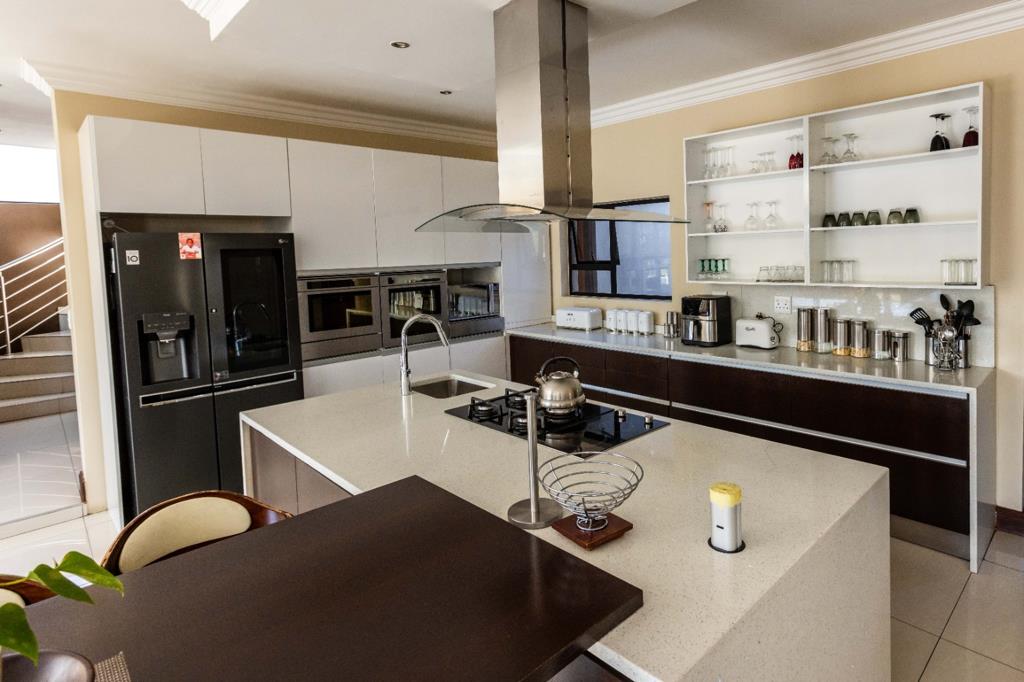 Stylish modern kitchen with a large breakfast nook, built-in oven and microwave, gas and electric hob, and space for a double-door fridge