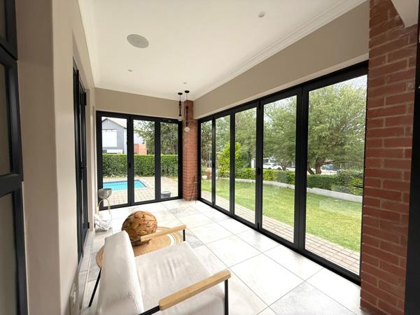 The kitchen is beautifully designed with a central island, ample cupboard space, and a large scullery that adds both practicality and convenience. A sunroom extends from the living areas and opens out to the private backyard, where youll find a sparkling swimming pool and a built-in braai, perfect for relaxed outdoor living.