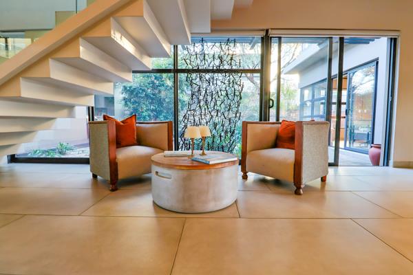 Additional features include four garages, staff accommodation, and a host of premium comfort and efficiency systems such as a central vacuum system, air conditioning, hydronic underfloor heating, and heat-pump geyser.