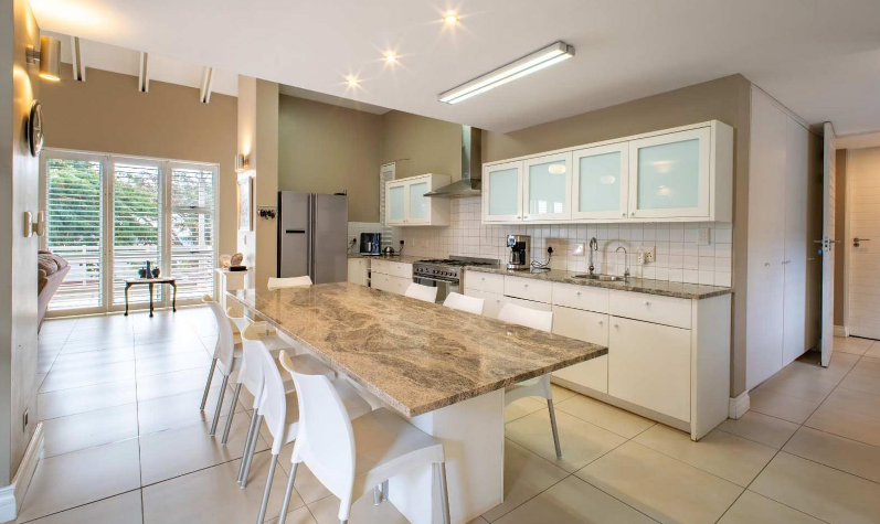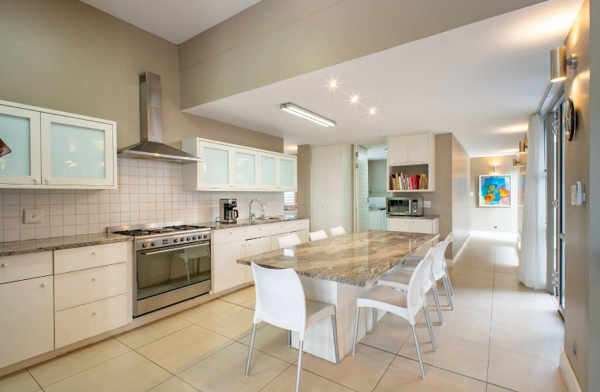 The well-appointed kitchen is designed for both functionality and style, complete with granite countertops, a SMEG gas hob and electric oven, and a large central dining island.