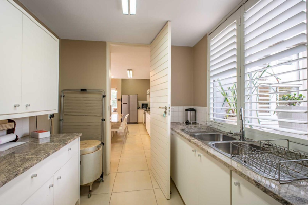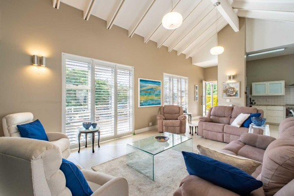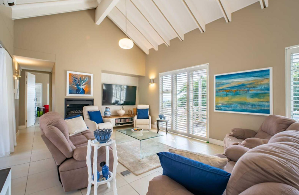 The main residence is centred around a bright indoor entertainment area featuring a built-in braai, splash pool, and stacking doors that create effortless indoor-outdoor flow. The open-plan living space includes a gas fireplace and extends onto a generous balcony with beautiful views of the surrounding estate and mountains.