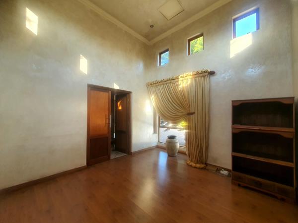 From the attractive front facade of the home with its cladded wall, cobble-stone paving, and indigenous foliage, the home makes an eye-catching first impression. Stucco walls, high ceilings and above-standard doors create a sense of grandeur and sophistication, once inside. Wooden architraves and stone cladded feature walls add character and charm to the interior, and quality wood and tile flooring, add a touch of luxury to the home.