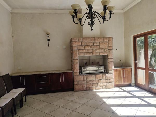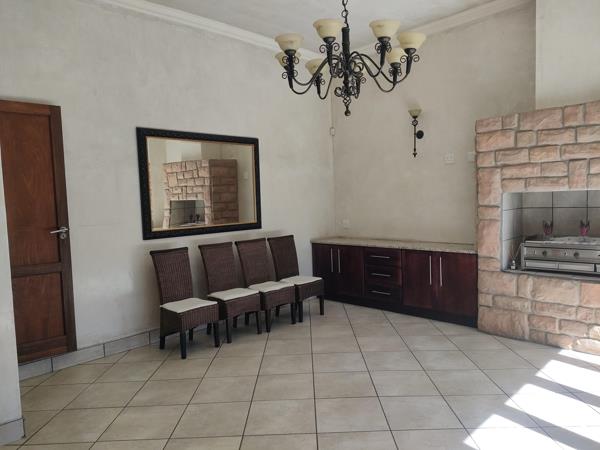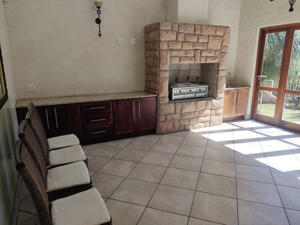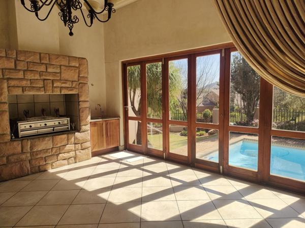 An enclosed indoor patio with a gas braai, serving counter, and prep bowl flows effortlessly to the garden and sparkling pool perfect for year-round entertaining.