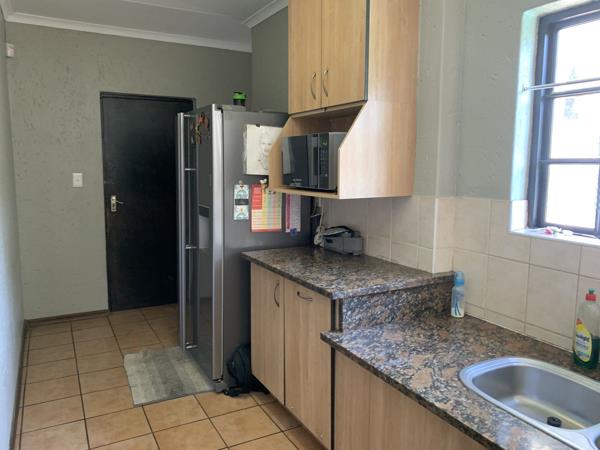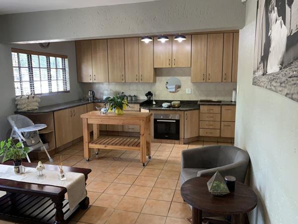 To the left of the living room is a large dining room area, with a modern kitchen, with ample cupboard space and beautiful granite tops. This leads to a scullery area with room for a washing machine, tumble dryer, dishwasher double fridge and deep freeze. Walking through the scullery, one enters into a laundry area which leads outside into the backyard. A beautiful and large entertainment area was built by the existing owners, fitted with ample cupboards as well as spaces for a stove or bar fridge, and a space for a dishwasher or washing machine. The room has a built-in sink.