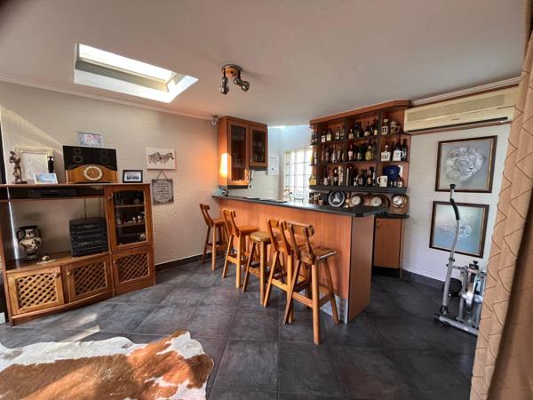 Looking for a property that is not dark and dingy but allows natural light to flood the house? Then this is the house for you. Glass bricks and multiple sky lights invites the natural light into the house creating a warm ambience. This is a perfect lock up and go home. This house is very spacious - enter through front gate into a covered patio - have breakfast/lunch/supper/drinks or sit and work in a protected outdoor area. There is a main lounge, an entertainment lounge that flows onto the pool area with built in bar and braai. The dining room is a separate room adjacent to the kitchen which has a scullery for all the applicances and the kitchen has a pantry. Sliding windows allows meals to be served to those who are enjoying the pool. Direct access from automated garage into the house. There is a guest toilet and storage space on the ground floor. Take the staircase lit by the natural lights to the first floor. A pajama lounge/tv lounge and a spacious but private balcony allows you to enjoy your morning coffee or afternoon tea. The 3 bedrooms are very spacious with ample storage space and each room has double doors. 2 bedrooms are serviced by a full bathroom with large shower. The master bedroom is massive with a double skylight with blinds to protect you from the harsh summer sun. There is a walk[-in closet that leads off the master bedroom. The bathroom is also very spacious with shower, bath, toilet, and double basins. There are also skylights in the bathroom. There is a linen closet at the end of the passage. No carpets - just lovely tiles throughout. There is a smaller room which could be a home office/a study or a guest bedroom. Most of the garden is paved which saves water and maintenance. The pool has a lovely waterfall and there is a small garden if you feel the need to dig into soil. There is a double carport in front of the garage so parking is sufficient. Want to know more about the safe and secure living in the gated area of Eldoraigne, please contact me for your private viewing.