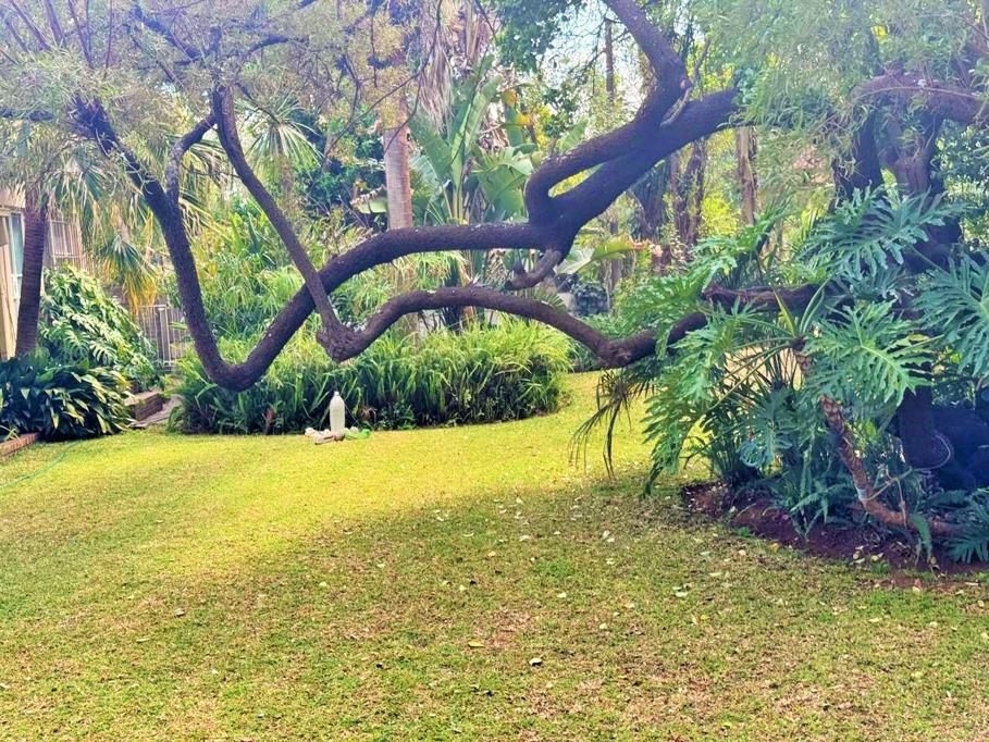 A lush garden filled with massive trees, supported by a borehole and irrigation system.