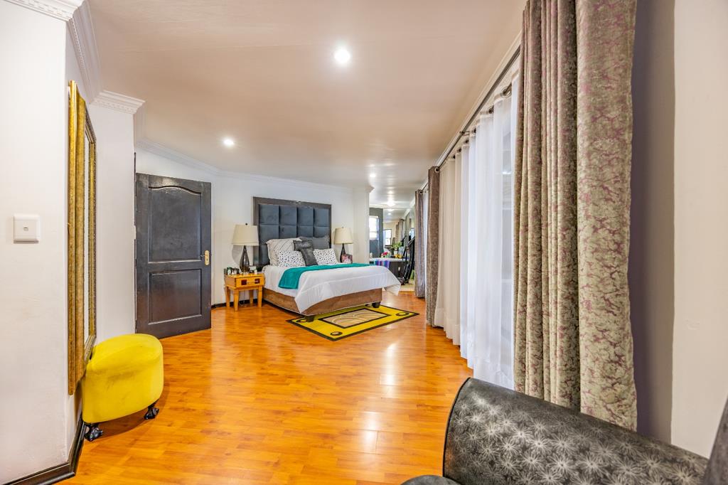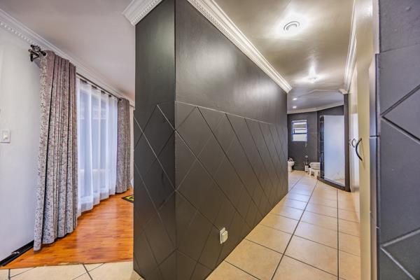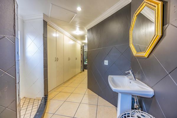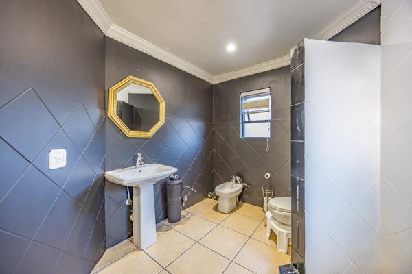 The ground floor features three bedrooms, a large office, a storage room, and ample space to run a practice or business from home, with the garage or study area well-suited for such use. The kitchen boasts marble countertops, a pantry/scullery, a breakfast counter, and room for three appliances, with a back door leading to the garden. A 3-car garage with electric doors, secure parking for at least five vehicles behind the main gate, and additional paved parking outside make this home ideal for both private and client visits.