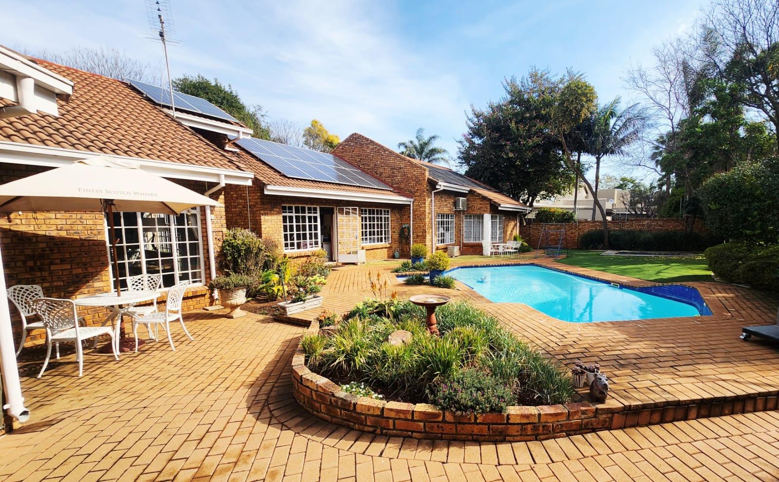 The kitchen, the heart of the home, is beautifully appointed with stunning granite countertops, abundant cupboard space, and a separate scullery and laundry area. An enclosed entertainment space awaits, complete with a stylish bar, a private bathroom with a shower, a gas braai, and a boma area for outdoor enjoyment. Step outside to discover a sparkling heated pool, a trampoline nestled within the beautifully landscaped garden, and convenient staff quarters.