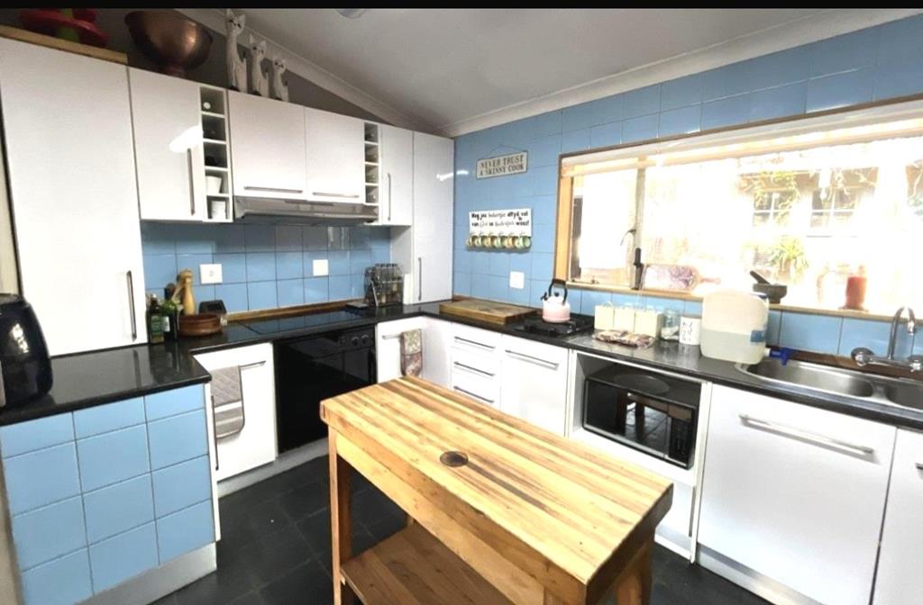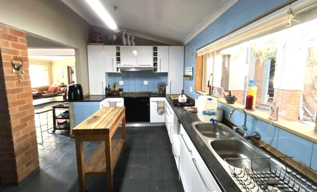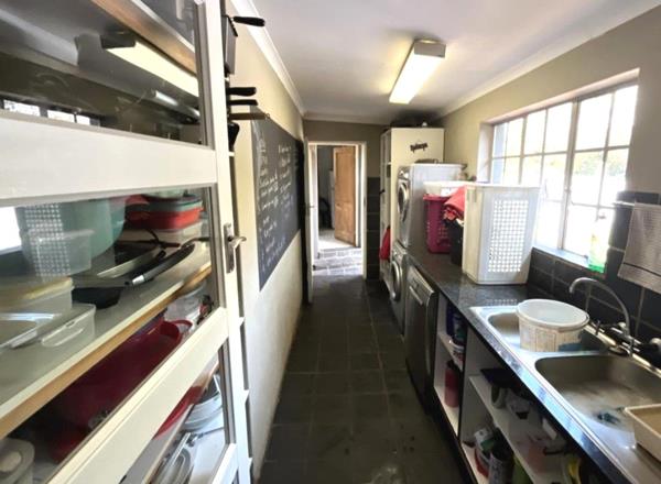 The kitchen is fitted with granite countertops, an electric stove and oven, a two-plate gas hob, ample cabinetry, and a walk-in pantry. A separate scullery leads to the backyard and domestic quarters.