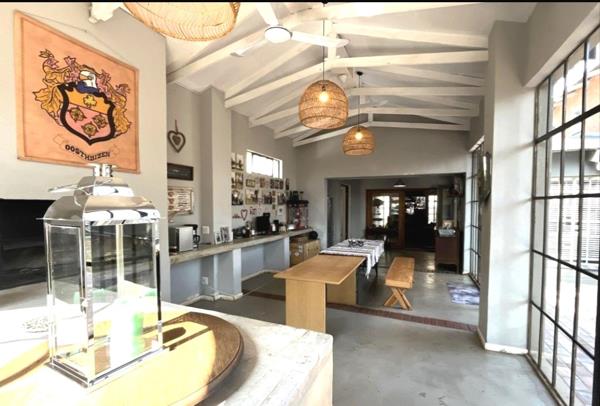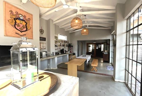 On the right wing, a private en-suite guest bedroom features its own gas geyser for energy-efficient comfort. This wing flows into an expansive entertainment area designed for effortless indooroutdoor living. Wide doors open to the garden and a charming boma, ideal for year-round gatherings.