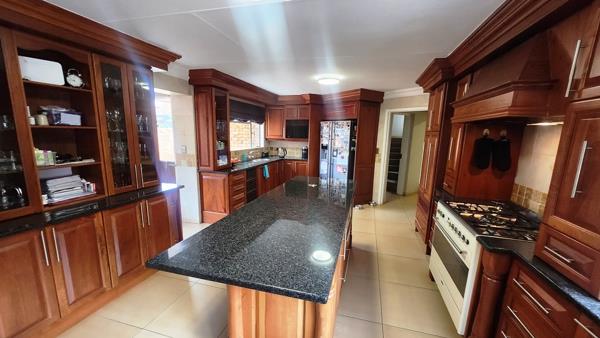 The kitchen is functional and well-equipped, boasting plenty of cupboard space, granite countertops, a gas stove with an extractor fan, and a separate scullery.