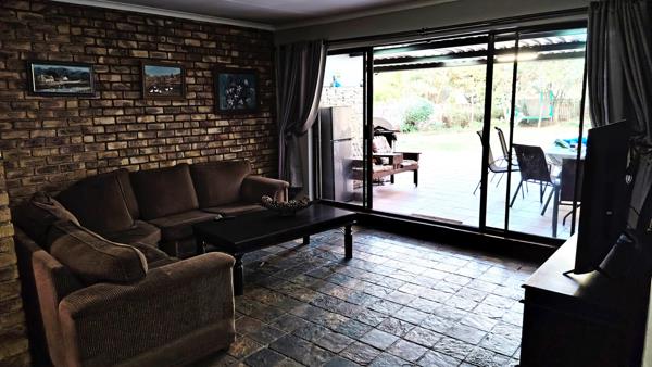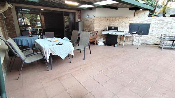 Covered Patio with built-in braai, ideal for entertaining while overlooking a large, tree-filled playground area.