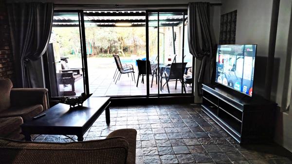 Open-plan Lounge TV Room featuring sliding doors that lead to a covered patio with views of the sparkling swimming pool.