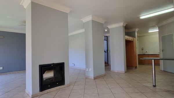 Open-plan living and dining area featuring a cozy fireplace, leading out to a covered patio with a built-in braaiperfect for entertaining.