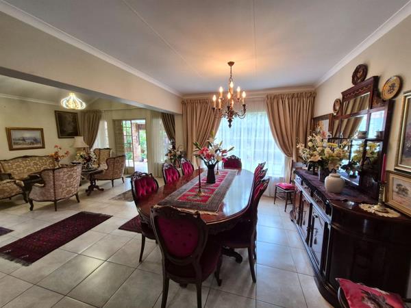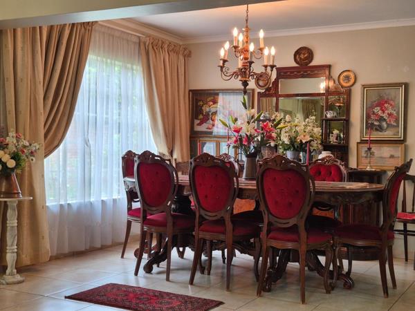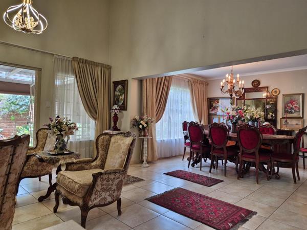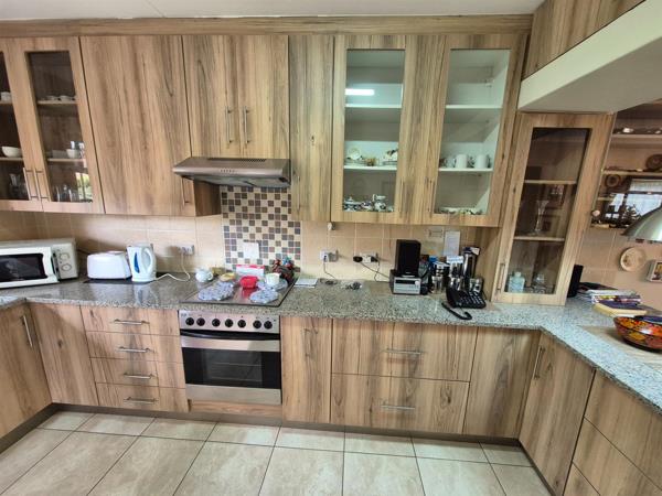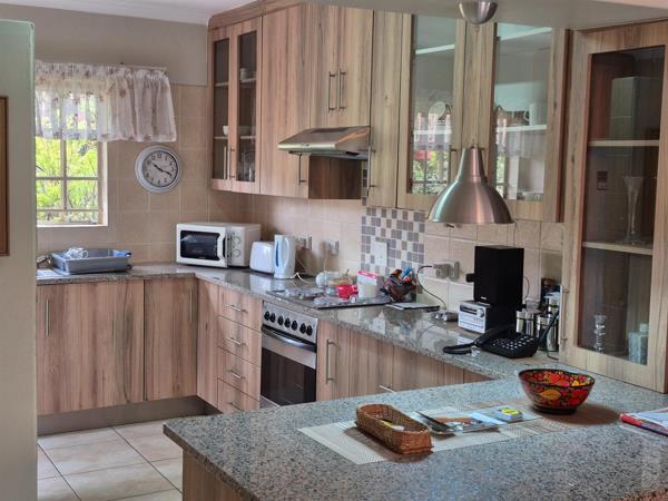 Boasting 142 m² of well-maintained living space, the home features a bright and airy open-plan lounge and dining area with beautiful light fittings, including a stunning chandelier in the dining area, that flows seamlessly into the modern kitchen. The kitchen comes with granite countertops, space for a double fridge, a stove with an extractor fan, a pantry, and a separate washing area, while the lounge and dining area open onto a covered patio with a built-in braai, perfect for entertaining.