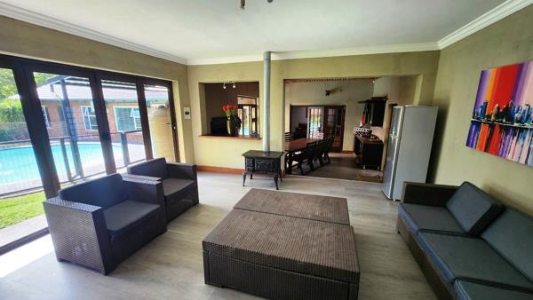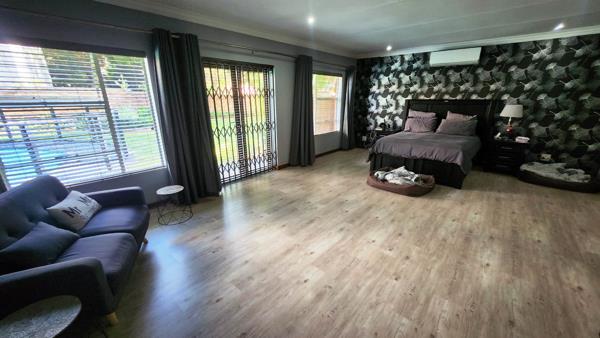 The former servants'' quarters have been transformed into a stylish nail boutique with an attached bathroom. The enclosed entertainment area is equipped with a braai and seamlessly connects to a boma area, a sparkling pool, and a spacious garden.