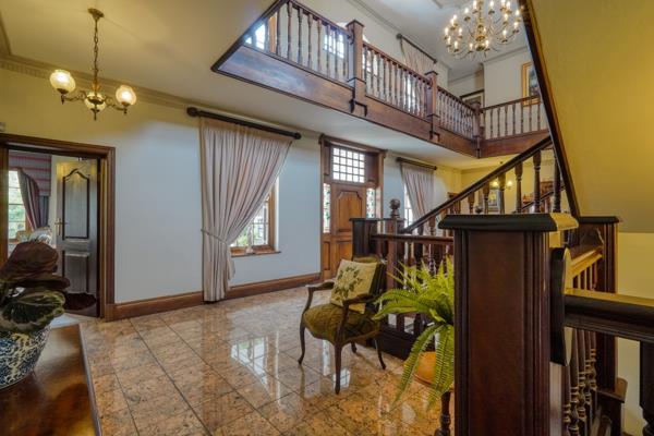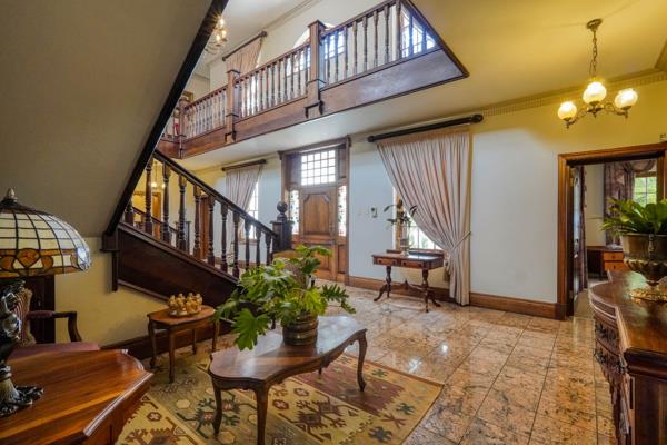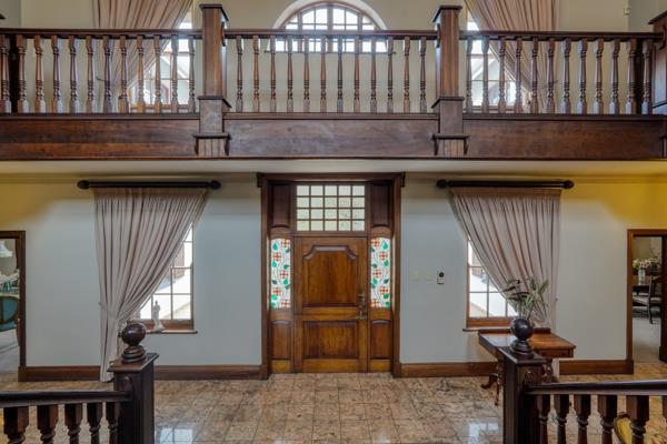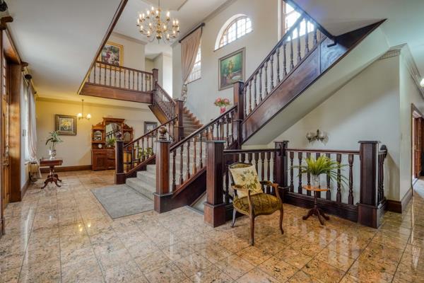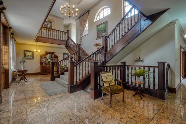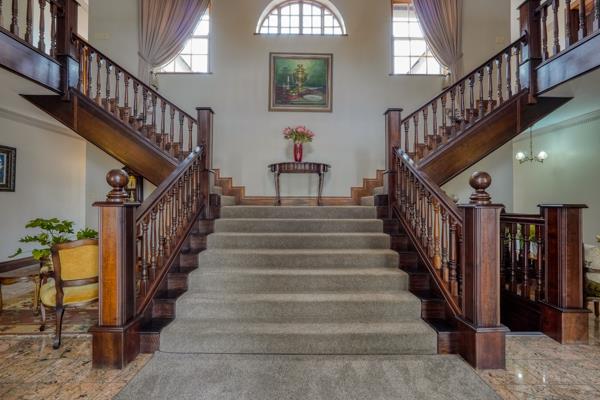 A secondary staircase near the main entrance leads downward and appears to descend into a basement, but instead guides you to the garages in the east wing, giving the home a rare three storey feel. Practical features include solar panels supported by two 5800W inverters and two geysers, ensuring efficiency to match the scale of the property.