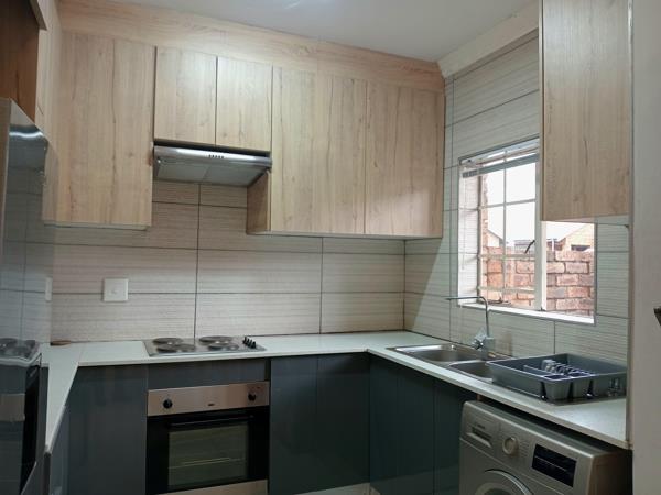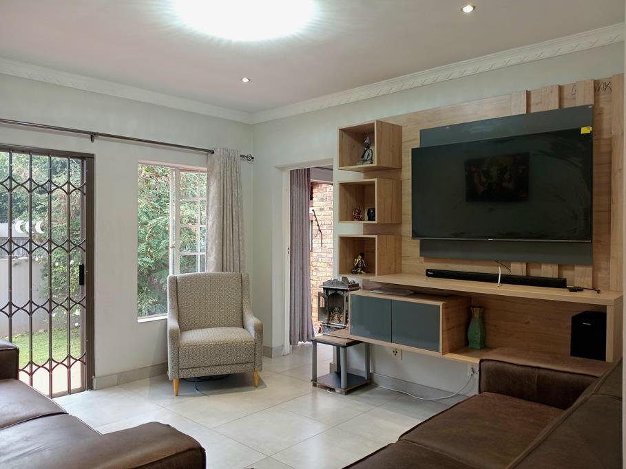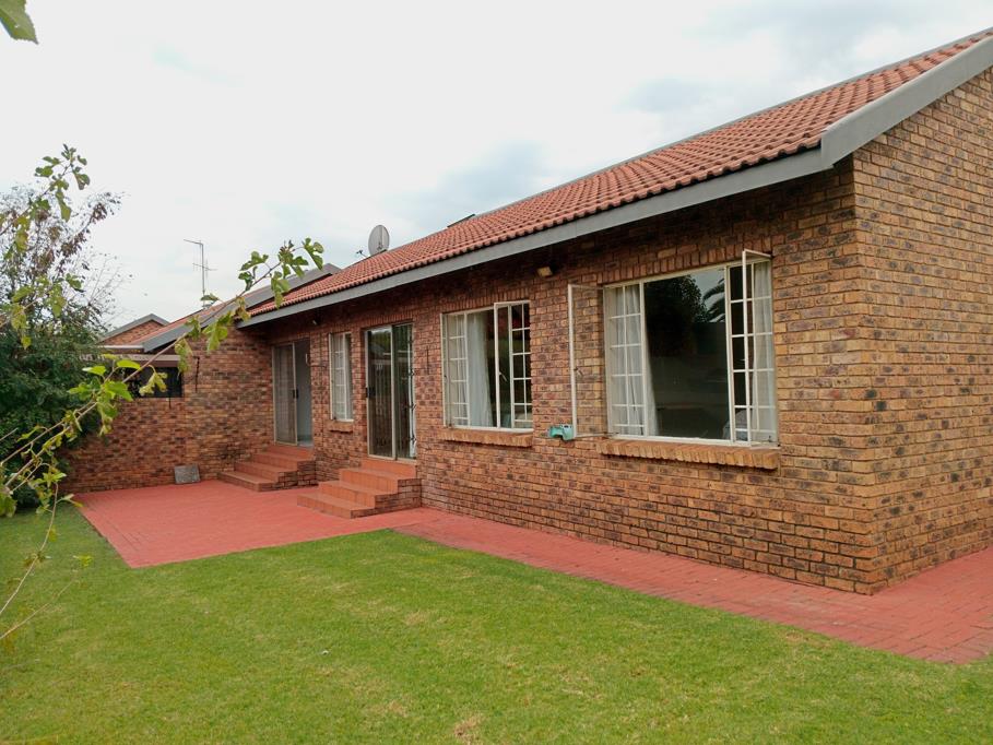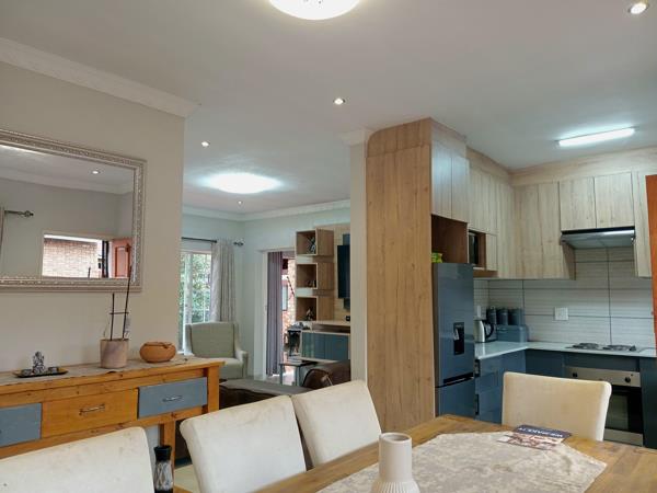 This unit is located within a secure, gated complex. It features two tiled living areas and an upgraded kitchen. There are three bedrooms, each with built-in cupboards and laminate flooring. As a corner unit, it boasts a spacious garden. Please note that the garage has been converted into an additional bedroom.